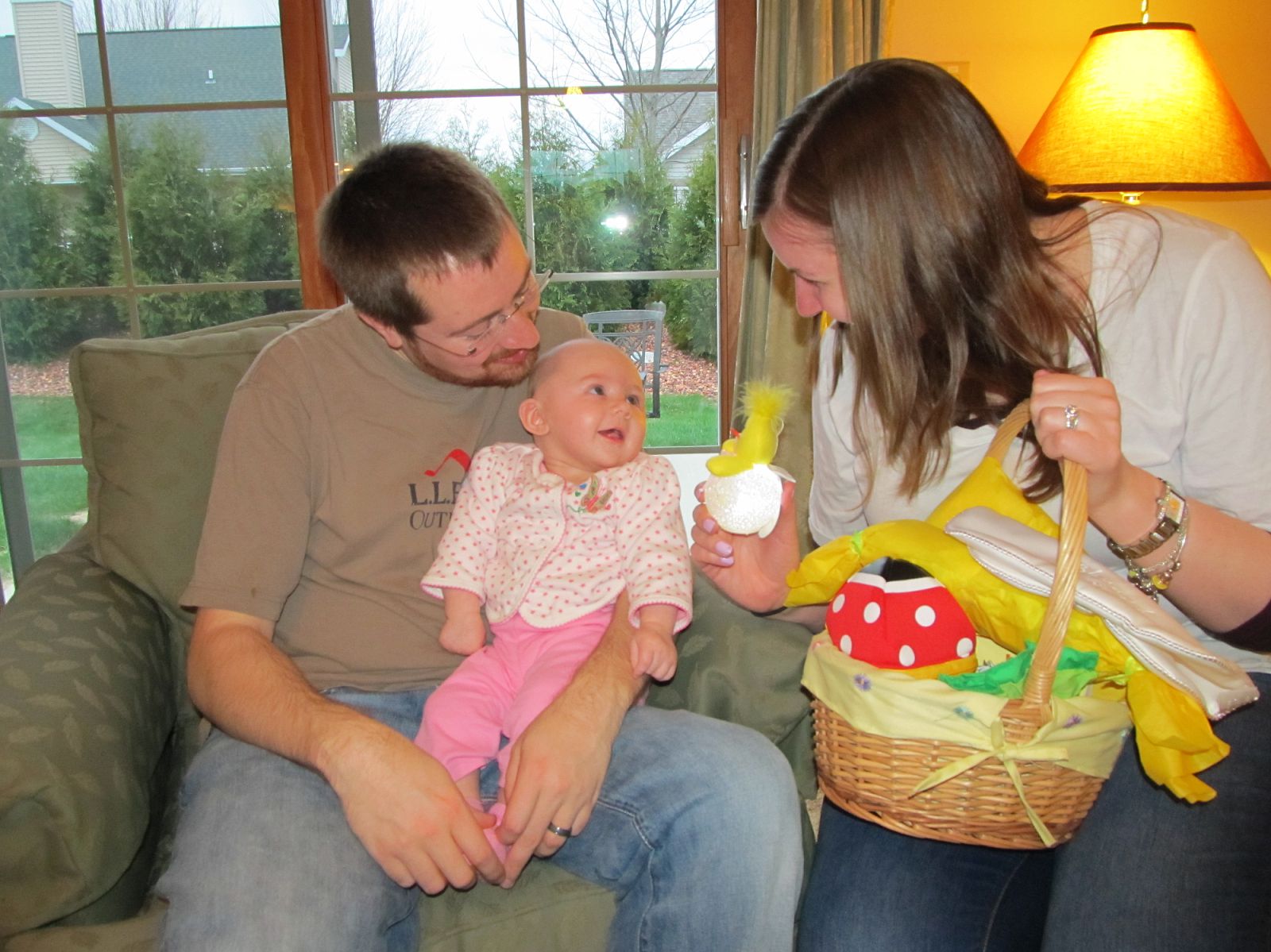 I hope everyone had a great Easter! Mine was spent with family at my parents' house. Saturday night, my brother and sis-in-law stopped by for dinner. Then Sunday, hubs, Bridget, and I went to my parents' church, where my dad preaches. It was a very nice service, and my dad even included a Harry Potter reference in his sermon (he often does movie references in church and in life). Everyone at church loved ooh-ing and ahh-ing over pastor's adorable granddaughter, too. Then, we headed back to their house for a tasty meal. Here are some pics from the weekend: